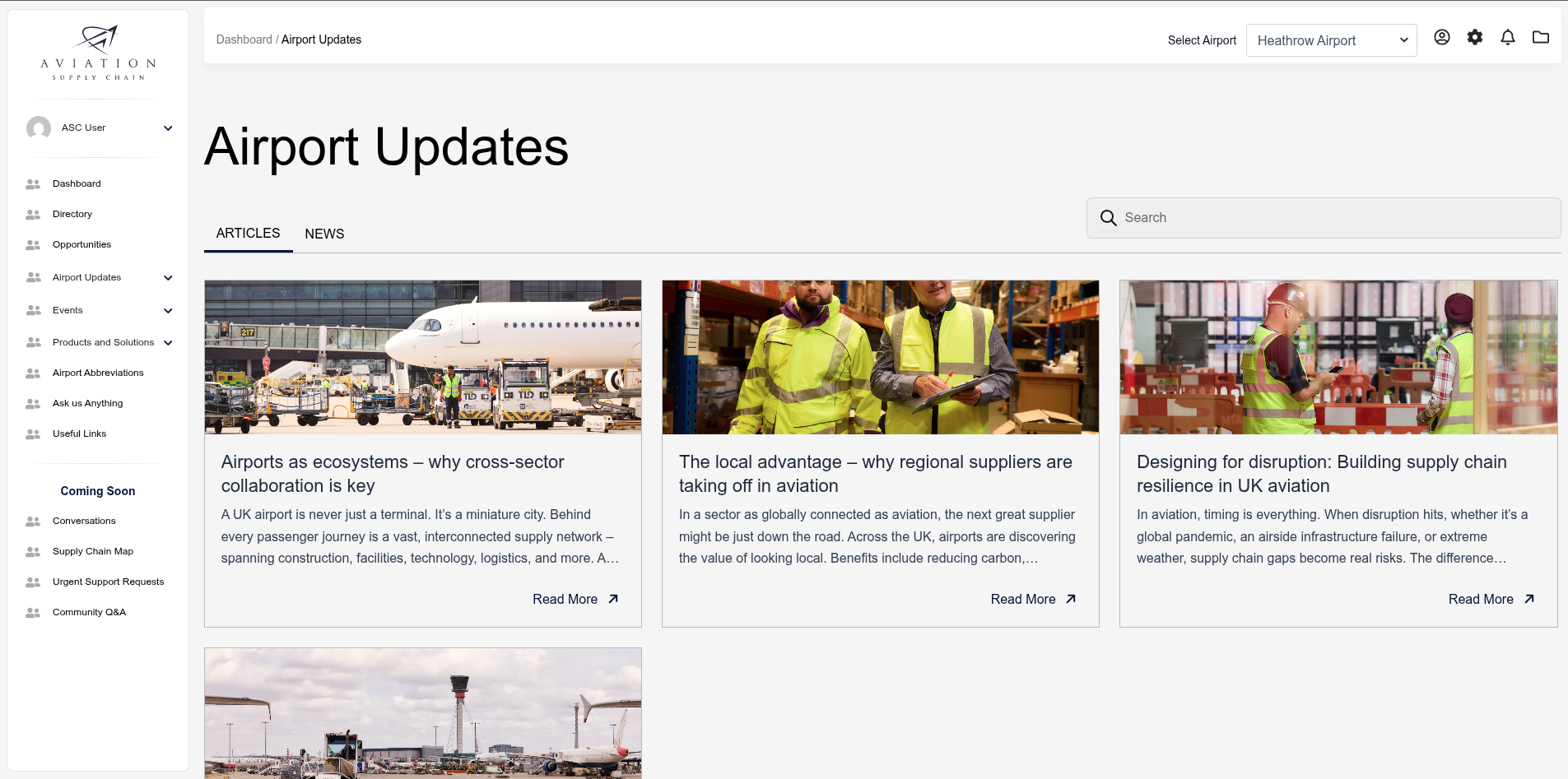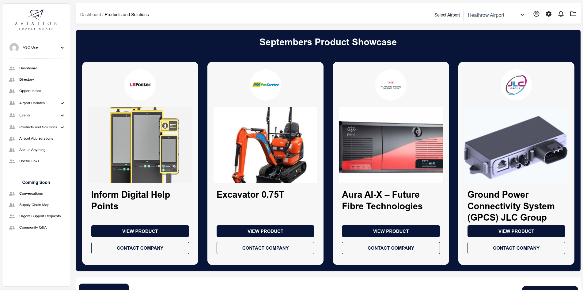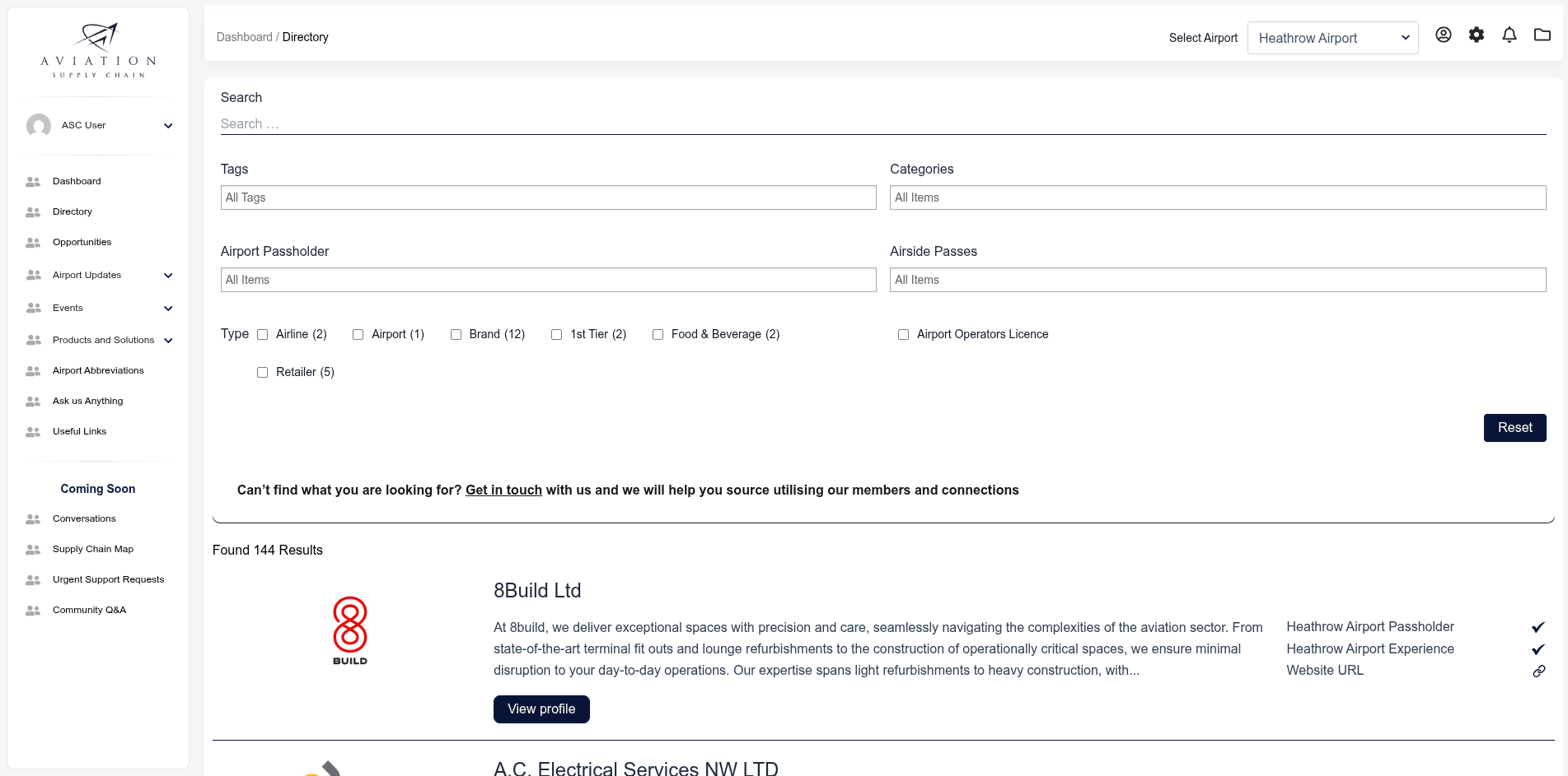 Aviation Supply Chain is where UK airport suppliers and contractors meet. We’re a trusted digital platform that helps you find the right people and get sight of opportunities. Find detailed supplier profiles, visible project opportunities, and a network built on collaboration rather than competition.